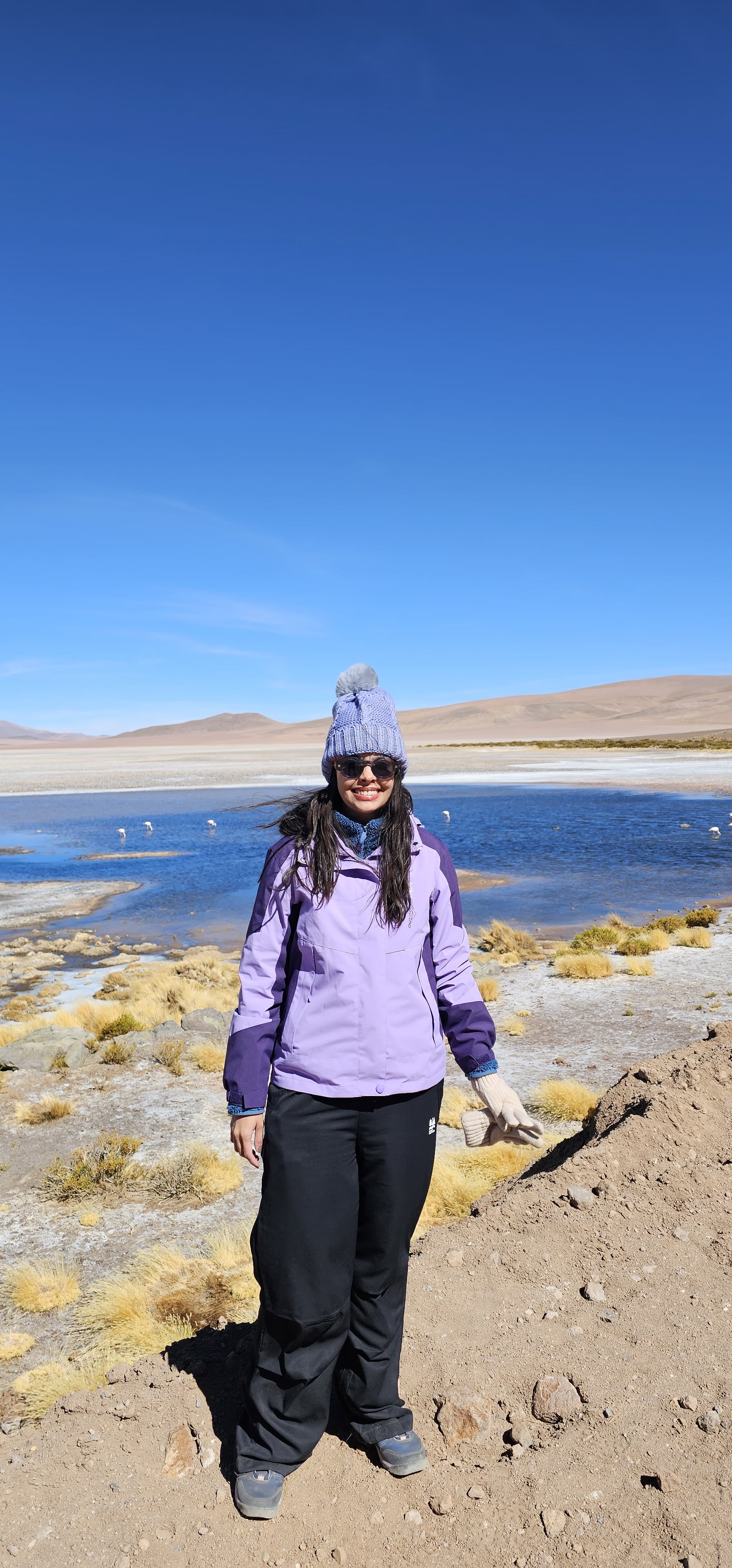 Passei ainda pelo Salar de Águas Calientes e cheguei à última parada: o Salar de Quisquiro. Ali, mais uma vez, uma paisagem inacreditável me fez esquecer o frio, o coração disparado, a dor de cabeça e os olhos que ardiam. Mais uma vez, fui confrontada com uma beleza impossível de ser capturada por fotos. A presença de quinze flamingos cor-de-rosa tornaram o momento ainda mais raro e especial, naquela que seria uma viagem inesquecível.